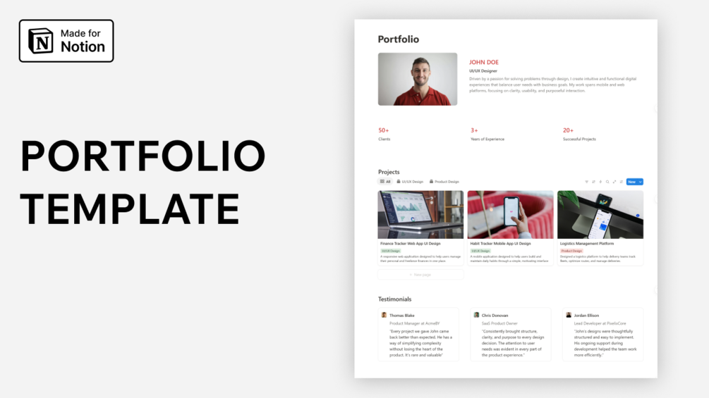Create a professional-looking portfolio inside Notion. This free Notion template includes everything you need: a space to introduce yourself, key stats, categorized projects, testimonials, and a contact section.